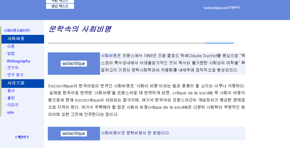 2004년도의 한국어와 프랑스어 두 개 국어로 구성된 sociocritique.com : 이제 이 구성은 아카이브로 남게 됩니다.